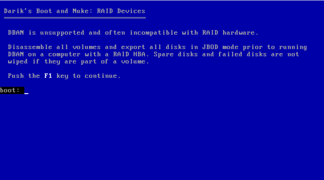 DBAN non è in grado di “cancellare” sistemi Raid; in questo caso dovete prima smontare la catena Raid e poi avviare DBAN.