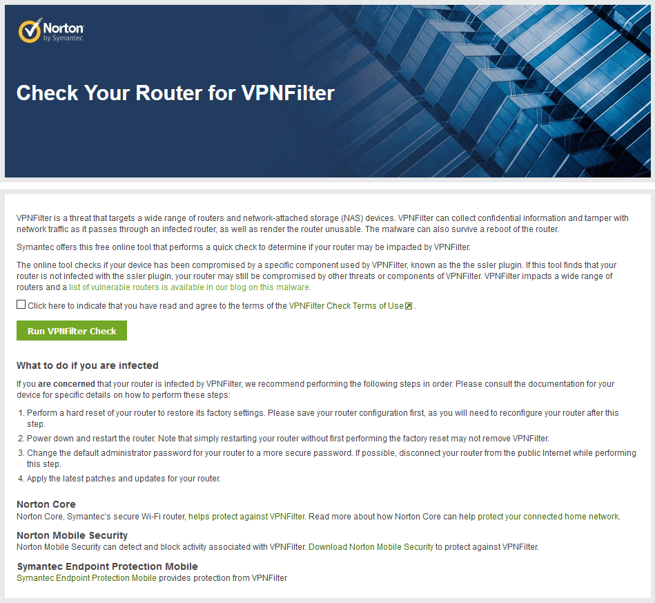 VPNFilter è la nuova “sensazione” nel mondo delle minacce informatiche per la Internet delle Cose (IoT), un malware progettato per infettare un gran numero router domestici e aziendali oltre a una particolare marca di dispostivi per lo storage di rete (NAS). Anche se l’obiettivo principale degli ignoti criminali sembra essere il mercato ucraino, fare il check-up al nostro router Internet è facile e veloce grazie a un nuovo strumento messo a disposizione da Symantec.