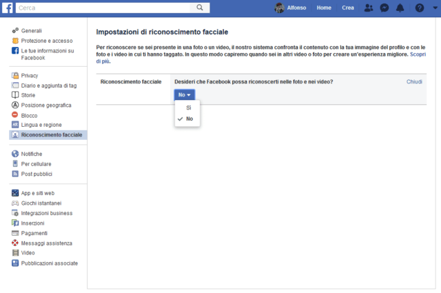 Le opzioni sul riconoscimento facciale di Facebook sono accessibili dalla pagina delle Impostazioni del servizio, quindi selezionando Riconoscimento facciale dalla colonna sulla sinistra: da questa pagina è possibile attivare o disattivare la funzionalità biometrica del social network, confermando poi la scelta facendo clic su Chiudi.
