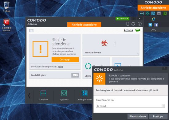 L’interfaccia di Comodo Antivirus è piuttosto intuitiva, con un moderato uso dei colori che sottolineano sempre lo stato della protezione e l’urgenza delle azioni proposte. La finestra principale ha due “lati”, un po’ come i prodotti di sicurezza Symantec di qualche anno fa: la faccia principale mostra lo stato della protezione, l’aggiornamento dell’archivio delle definizione e permette di attivare la modalità Gioco, che non mostra nessuna notifica. Girando invece la finestra (un’animazione sottolinea questo cambio di contesto) si può visualizzare la seconda faccia, con pulsanti dedicati a tutte le attività principali del software: qui si trovano i comandi per avviare la scansione, aggiornare il database delle firme, visualizzare il registro degli eventi e l’elenco dei file in quarantena e così via. Molto interessante è lo strumento di sandboxing, chiamato Desktop virtuale (la denominazione potrebbe creare qualche confusione con l’omonima funzione di Windows 10), che permette di aprire un ambiente completamente isolato rispetto al resto del sistema operativo, da utilizzare per l’home banking, lo shopping o altre operazioni delicate.