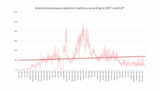 Per quanto riguarda i ransomware, questo tipo di virus si è diffuso in modo notevole, seppur non uniforme: ESET ha infatti rilevato un picco importante di attacchi ransomware su Android nel gennaio 2016, ma successivamente c’è stato un calo, e già nel mese di marzo questi erano scesi al 35% rispetto a quelli di gennaio, toccando un minimo del 5% a novembre. Va segnalato comunque che questo potrebbe essere solamente un caso congiunturale, e nuovi picchi potrebbero seguire. Va inoltre segnalato, comunque, che non sono mancati altri tipi di attacchi rivolti a dispositivi mobile, specie quelli mirati a infiltrare le reti aziendali (come MilkyDoor e Switcher).