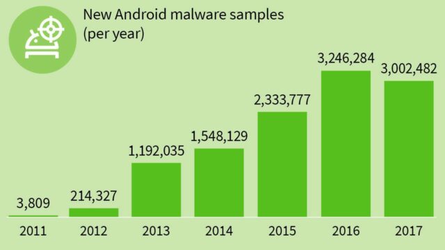 Una media 343 nuovi malware vengono progettati per Android ogni ora, e nonostante il lavoro fatto da Google, tramite il Play Secure, diverse app maligne riescono comunque ad arrivare su Play Store. 700mila sono stati contenuti cancellati durante il 2017, includendo app copycat, contenuti offensivi e malware: il 70% in più rispetto al 2016.