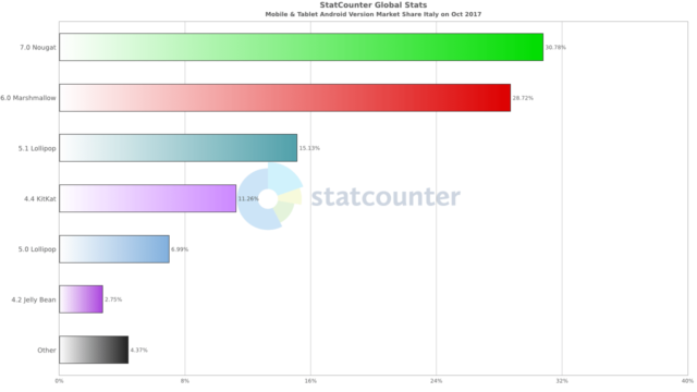 G Data ha segnalato una tendenza preoccupante per quanto riguarda Android, le cui patch di sicurezza sono generalmente rilasciate molto in fretta, ma diffuse esclusivamente sui device di produzione propria, mentre i dispositivi di terze parti risultano spesso indietro con gli aggiornamenti: tra gli utenti Android a livello globale, soltanto il 18% utilizza la versione 7.0, mentre il restante 82% si affida ancora a versioni più vecchie, e quindi più vulnerabili.