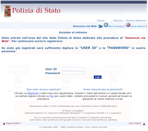 Il portale della Polizia di Stato dove è possibile registrare il proprio account prima di procedere all’avvio dell’iter di denuncia.