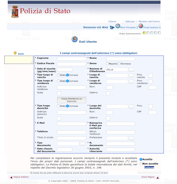 Oltre a questo viene richiesto al cittadino di registrarsi al sistema informatico della Polizia di Stato fornendo alcuni dei propri dati personali che sono richiesti per una duplice esigenza: la prima è di natura tecnica e serve a creare un fascicolo digitale dal quale sono prelevati i dati personali necessari a compilare una denuncia completa; la seconda è relativa alle attività di riscontro a tutela della sicurezza del cittadino e permette di evitare l’uso fraudolento delle generalità del cittadino stesso. La procedura di registrazione deve essere espletata solo la prima volta che si utilizza il servizio, mentre rimane accessibile al cittadino la possibilità di modificare i dati registrati in caso di variazioni successive.