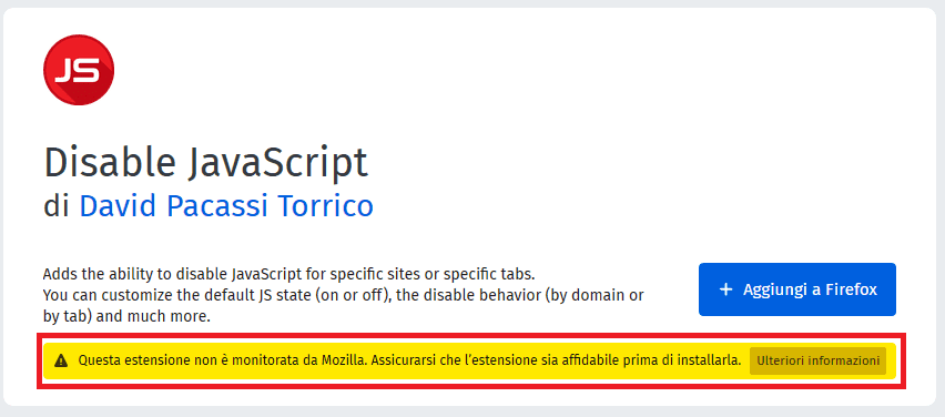 I controlli automatici – e le limitate funzionalità di WebExtensions – continuano a garantire la sicurezza di base delle estensioni disponibili sul repository dei componenti aggiuntivi, ma in questi ultimi giorni è comparso un messaggio di avviso su una parte preponderante delle estensioni che recita letteralmente così: Questa estensione non è monitorata da Mozilla. Assicurarsi che l’estensione sia affidabile prima di installarla.