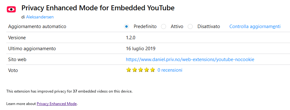 Fortunatamente, almeno per chi utilizza Mozilla Firefox, è possibile forzare l’attivazione della modalità di privacy avanzata installando un’estensione chiamata Privacy Enhanced Mode for Embedded YouTube. Una volta aggiunto al profilo del browser, l’add-on agirà in maniera automatica sostituendo l’URL del dominio standard di YouTube con quello “no cookie” in maniera trasparente rispetto all’utente. L’unica “opzione” aggiuntiva fornita dall’estensione, infatti, è un contatore per il numero dei video “privatizzati” consultabile dalla pagina delle estensioni installate sul browser (about:addons).