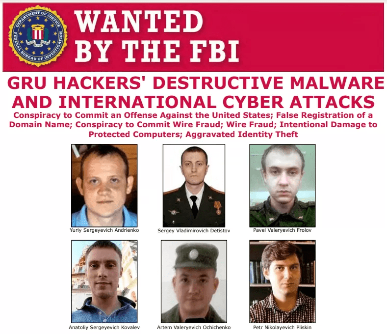 L’imputazione del DoJ chiama direttamente in causa il GRU, l’agenzie di intelligence militare della Federazione Russa, e fa i nomi e i cognomi dei sei cyber-criminali ora ricercati dall’FBI: Yuriy Sergeyevich Andrienko, Sergey Vladimierovich Destistov, Pavel Valeryevich Frolov, Anatoiy Sergeyevich Kovalev, Artem Valeryevich Ochichenko, Petr Nikolayevich Pliskin.