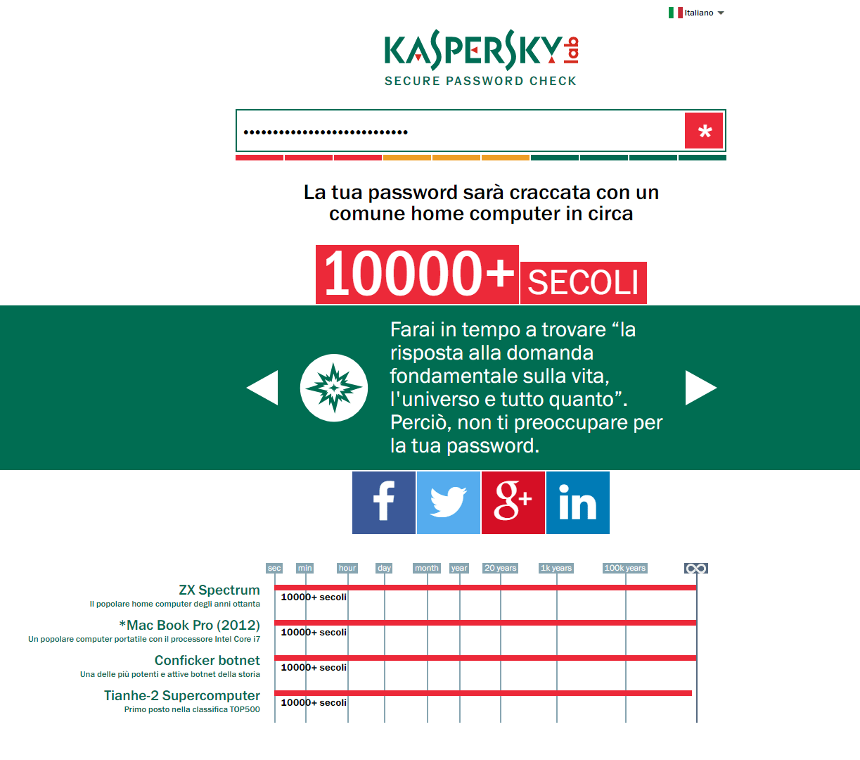 Prima di passare ai consigli degli esperti, vi invitiamo a provare quanto sono “sicure” le password che usate. Online ci sono diversi tool che vi indicano in quanto tempo sarebbe possibile craccare le vostre password. Tra i diversi tool online ve ne indichiamo due: How Secure Is My Password e Kaspersky Secure Password Check.