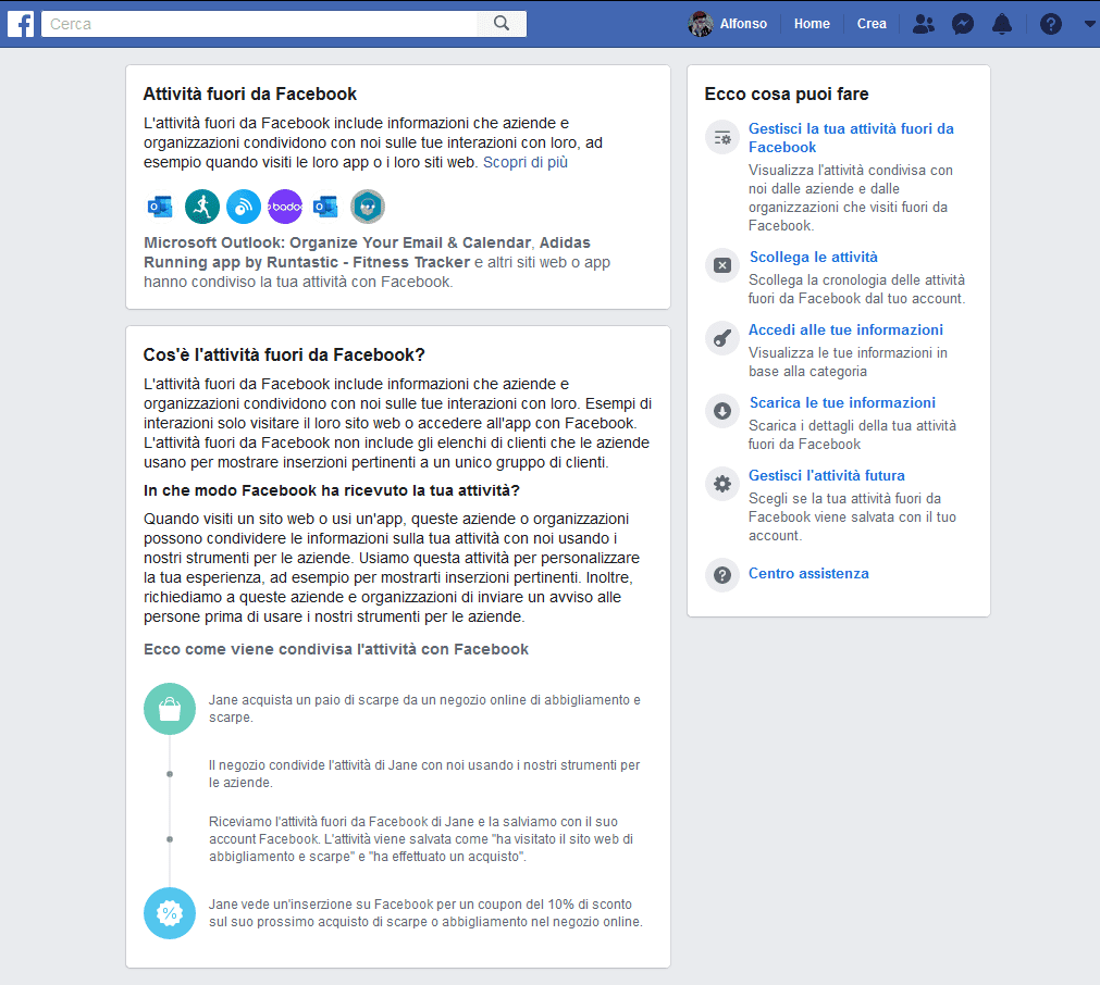 Accessibile dalle impostazioni del social network o tramite link diretto alla pagina dedicata, lo strumento Attività fuori da Facebook fornisce “un riepilogo delle attività che le aziende e le organizzazioni condividono” con il social network, le interazioni con le app, le visite ai siti Web e altro ancora. La pagina principale del nuovo tool fornisce una spiegazione sul suo utilizzo, presenta un breve elenco delle app o dei siti Web che hanno di recente condiviso la nostra attività con Facebook (in alto a sinistra) e presenta una serie di link operativi nel riquadro sulla destra.