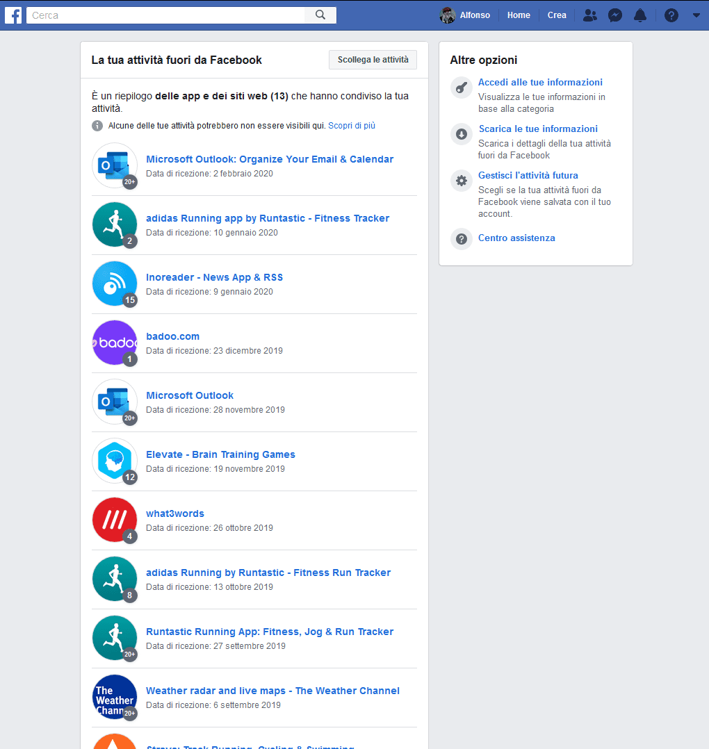Le opzioni meno interessanti incluse nel suddetto riquadro permettono di “scollegare” tutte le attività esterne connesse al nostro profilo, di accedere o scaricare alle informazioni che abbiamo immesso sul suddetto profilo (post, “like”, immagini ecc.), di gestire l’attività futura o di visitare il centro assistenza. L’opzione più interessante è la prima, Gestisci la tua attività fuori da Facebook, e ci permette di consultare (dopo aver confermato la password di accesso al social network) l’elenco dettagliato di tutte le interazioni tra le aziende esterne e Facebook.