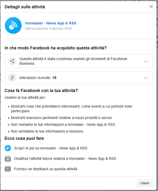 L’elenco delle app e dei servizi esterni a Facebook è interattivo: facendo clic su una singola voce apriremo la pagina corrispondente in sovraimpressione, e da qui avremo modo di consultare il modo in cui Facebook ha interagito con la app o il sito, il numero totale di interazioni ricevute (apertura app, accesso effettuato con Facebook, ricerche e altro ancora), il modo in cui Facebook usa l’attività della società esterna, e infine potremo (volendo) disattivare l’attività futura o fornire un feedback al social network.