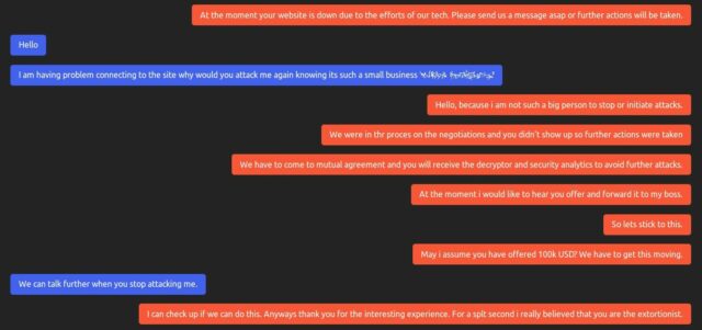 Secondo quanto rivelato dalla chat tra vittima e carnefici estrapolata da MalwareHunterTeam, i criminali di SunCrypt hanno confermato l’attacco DDoS contro il sito Web dell’organizzazione colpita come ritorsione per la scarsa collaborazione nella “negoziazione”. L’obiettivo dei criminali era riallacciare i contatti, quindi spingere per il pagamento di un riscatto allo scopo di sbloccare i file.