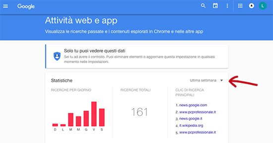 • Accedete al vostro account Google e andate alla pagina Attività  Web e app, vedrete subito  una pagina con le vostre ricerche web dell’ultima settimana.
