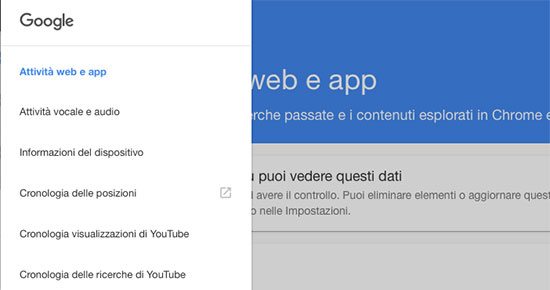 • Sempre all’interno della pagina Attività  Web e app fate clic in alto a sinistra sull’icona del menù a panino. Troverete la cronologia delle vostre posizioni, e delle visualizzazioni e ricerche di YouTube. Ognuna delle voci è gestita separatamente e cancellabile.