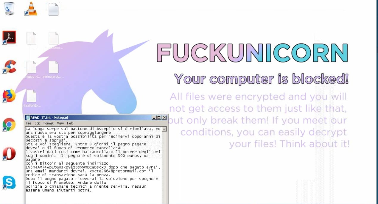 Identificato dai ricercatori e analizzato dal CERT (Computer Emergency Response Team) dell’AGID, Fuckunicorn ha il modus operandi tipico dei malware criptafile. Una e-mail in italiano invita a scaricare un file eseguibile o un archivio RAR, con la presunta garanzia data dalla Federazione dei Farmacisti Italiani (FOFI).
