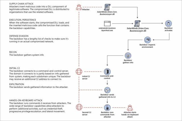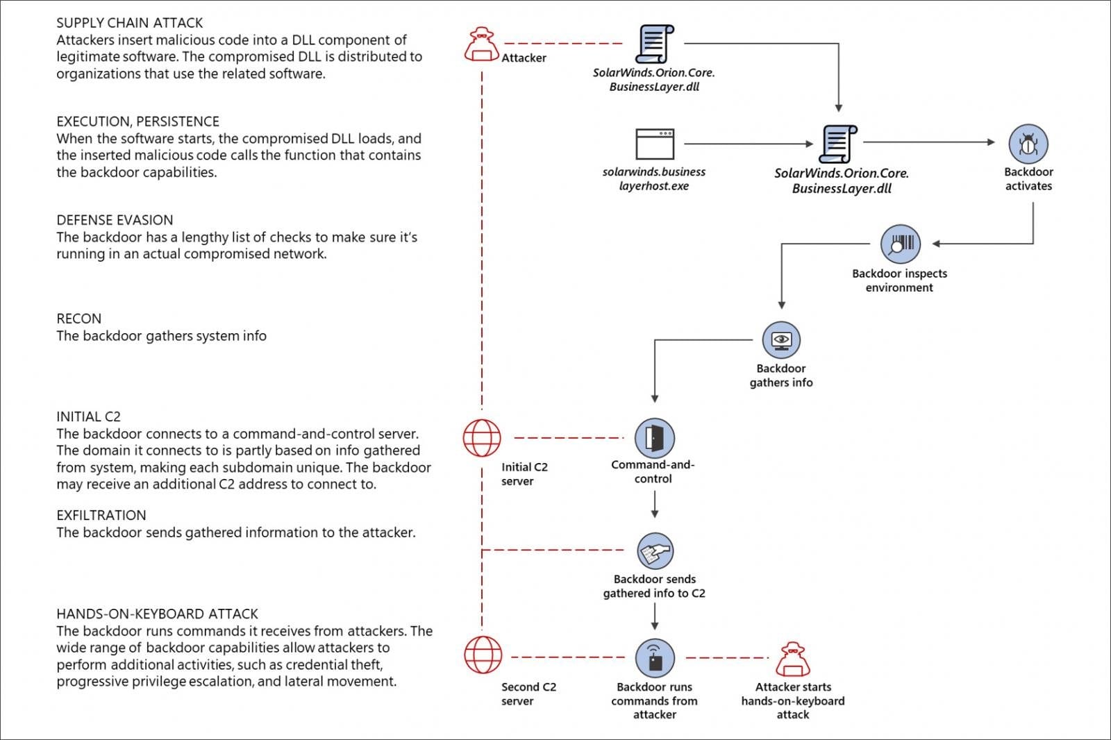 L’esistenza dell’attacco contro SolarWinds è stata identificata due settimane fa, quando la security enterprise FireEye si è accorta di essere caduta vittima di cyber-criminali estremamente motivati e capaci. Gli hacker hanno raggiunto i sistemi di FireEye attraverso Orion, sfruttando in particolare una backdoor impiantata in precedenza (tramite il download e l’installazione di una libreria DLL malevola) attraverso il sistema di aggiornamenti automatici di SolarWinds.