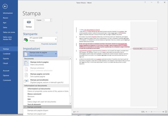 Una volta richiamata la finestra di stampa (File/Stampa) basta infatti fare clic sulla freccia verso il basso che si trova all’estremità della prima opzione presente nella zona Impostazioni (di solito Stampa tutte le pagine), e poi togliere la spunta alla voce Stampa commenti. I marcatori delle revisioni e i commenti scompariranno immediatamente dall’anteprima e non saranno presenti in stampa. La modifica non è permanente: appena si ritorna alla fase di modifica del documento, l’opzione Stampa commenti viene riportata al valore predefinito.