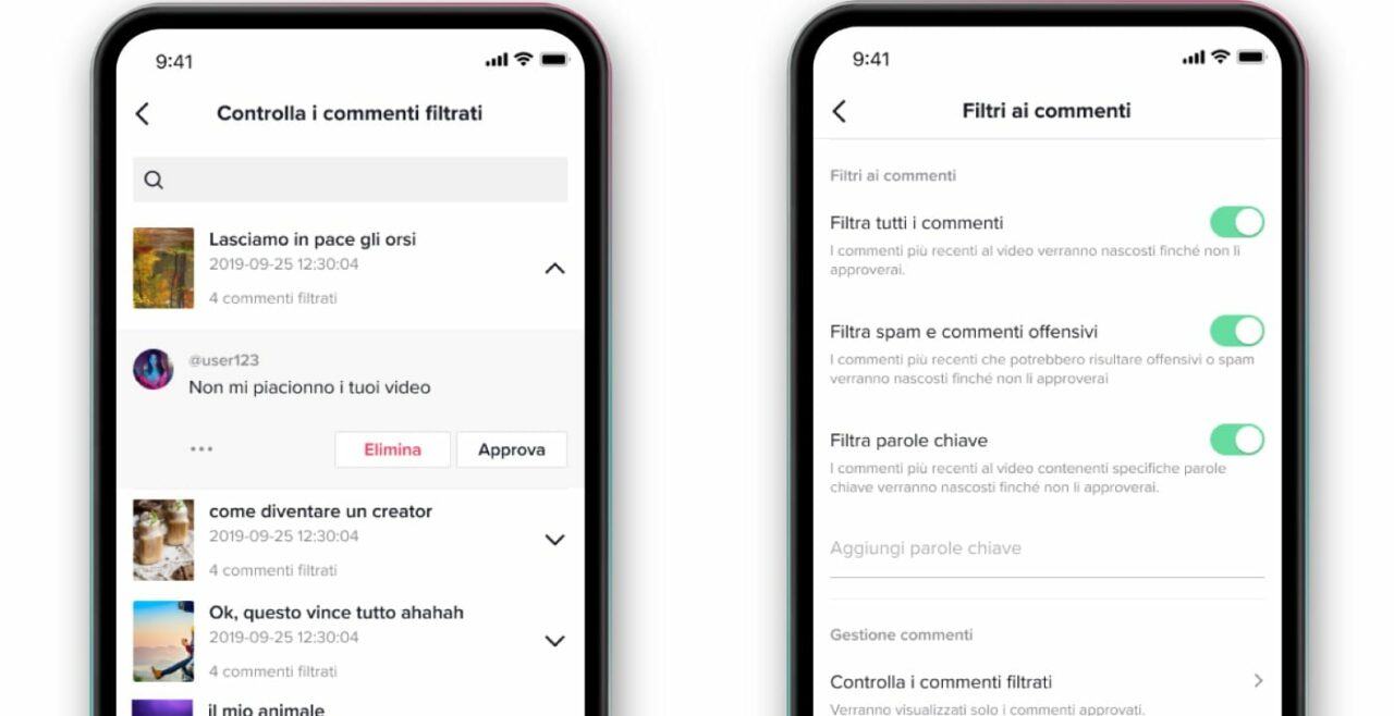 La funzione di TikTok per i creator si chiama Filtra Tutti i Commenti, e permette agli utenti di decidere quali commenti mostrare sotto ai loro video. Quando il filtro è attivo, i commenti non saranno visibili a meno che il creator del video non li approvi utilizzando il nuovo strumento di gestione. Questa funzione permette quindi di gestire il proprio spazio e fornire alla propria community un luogo senza possibili minacce. Inoltre, già da tempo, i creator possono eliminare lo spam e i commenti offensivi, indicando parole chiave.