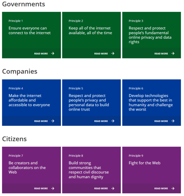 Il Contratto per il Web promosso da Berners-Lee sancisce nove principi fondamentali, tre dedicati ai governi, tre alle aziende e tre ai cittadini comuni: i governi devono garantire la connessione a Internet per tutti, mantenere Internet sempre disponibile e rispettare (o proteggere) i diritti fondamentali degli utenti alla privacy e all’uso equo dei dati; le aziende devono offrire connettività a un prezzo sostenibile e accessibile a tutti, rispettare e proteggere la privacy, sviluppare tecnologie in grado di “supportare il meglio dell’umanità” e contrastare il peggio; gli utenti devono essere creatori di contenuti e collaboratori per il Web, costruire community forti e rispettose, e devono infine “combattere” per il futuro del Web.