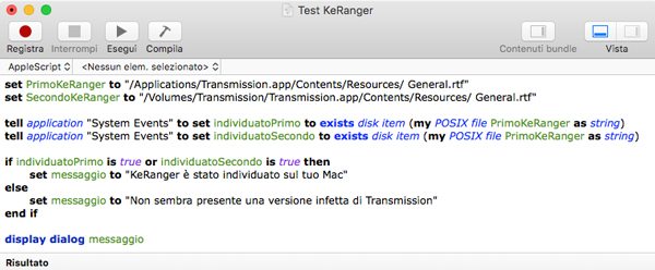 Noi cogliamo l’occasione per togliere un po’ di polvere ad AppleScript, il sistema di scripting presente su qualsiasi Mac dagli anni ’90 a oggi. Con poche righe di codice possiamo verificare se sul disco fisso è presente il finto file .rtf che contiene il codice maligno. Basta aprire ScriptEditor (si trova nella cartella Applicazioni/Utility) e copiare queste righe: