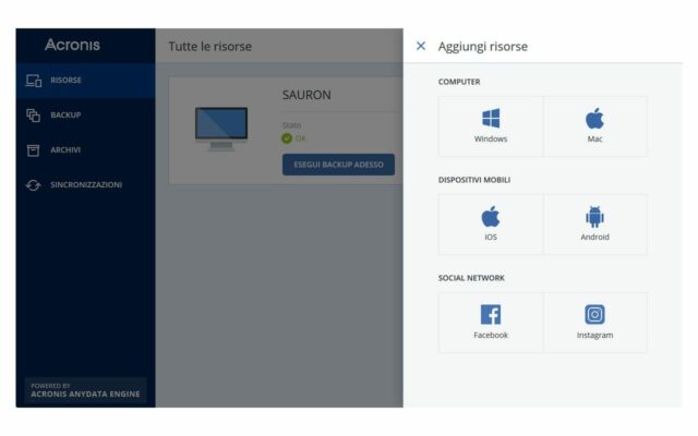 La funzione di backup dei social network si imposta dalla dashboard online; le informazioni possono essere salvate soltanto nel cloud.