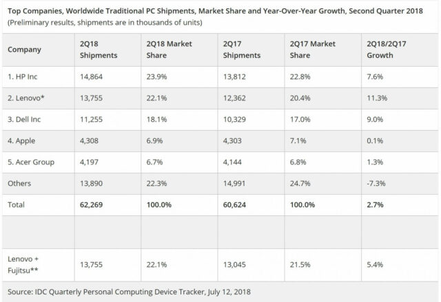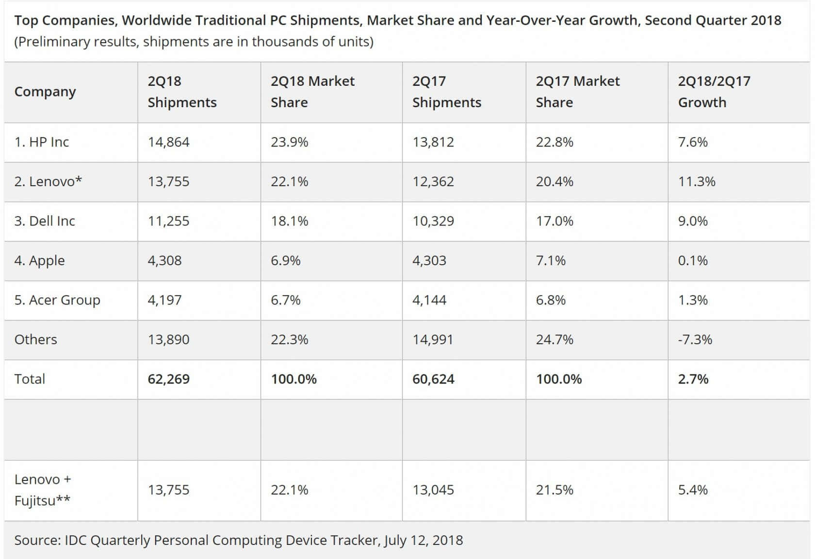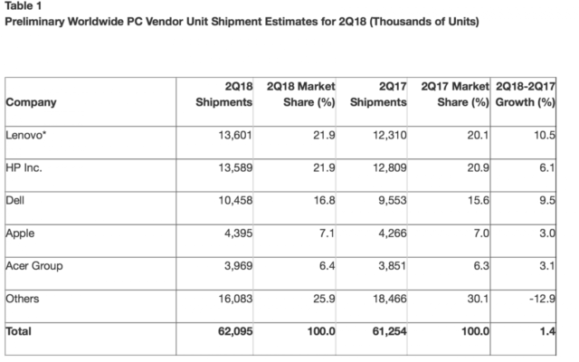 In particolare Gartner ha stimato a 62,1 milioni di unità il numero di PC commercializzati nel secondo trimestre del 2018, con un +1,4% rispetto allo stesso periodo dell’anno scorso; i cinque principali produttori (Lenovo, HP Inc, Dell, Apple, Acer) sono tutti in crescita, con i primi tre a dividersi la stragrande maggioranza della torta del mercato con quote del 21,9%, 21,9% e 16,8%.