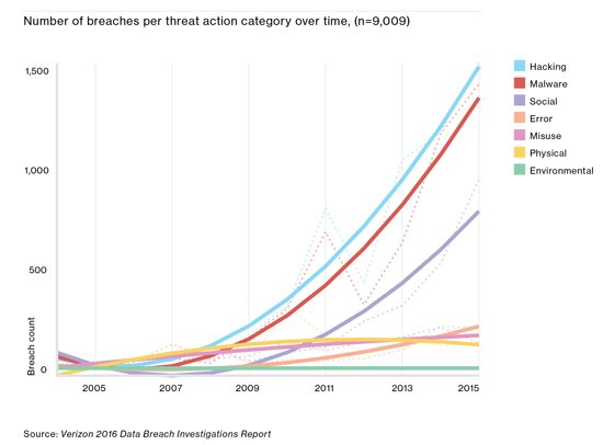 Nel report di quest’anno, così come già rilevato nell’edizione 2015 dello studio, la compromissione di dispositivi mobili o dell’Internet of Things non rappresenta un fattore significativo. Tuttavia, l’edizione 2016 del DBIR evidenzia come esistano già una serie di prototipi di exploit e che si tratta perciò solo di una questione di tempo prima che si verifichi una violazione su più larga scala che coinvolga dispositivi mobili e IoT. Ciò significa che le organizzazioni non possono abbassare la guardia e devono proteggere i propri smartphone e i vari oggetti connessi.