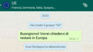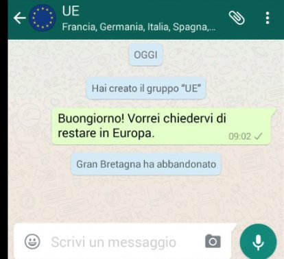 Infine anche il gruppo di WhatsApp UE dove compare la scritta Gran Bretagna ha abbandonato e la gif animata con i Beatles che salutano.