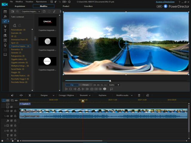 PowerDirector gestisce bene i video a 360 gradi: può visualizzarli e modificarli in modalità appiattita o stenderli su una sfera virtuale, per ritagliarne una porzione.