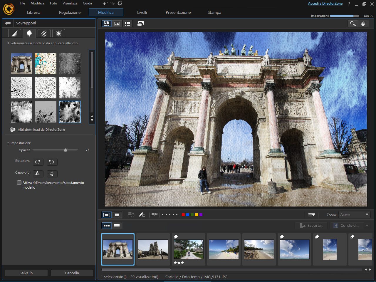 Nel modulo Modifica si trovano le novità di principali della versione 8. In Effetti foto/Sovrapponi sono disponibili più di 40 immagini (altre sono scaricabili da DirectorZone) da sovrapporre alla fotografia, per ottenere effetti grafici interessanti e originali come colpi di luce, screpolature o trame che simulano i metalli spazzolati. Il filtro Effetti colore/Macchia colore elimina dall’immagine le informazioni sul colore, trasformandola in bianco e nero tranne le zone con una tinta particolare selezionata in precedenza. Per rifinire i bordi della selezione si può usare un pennello che, grazie all’opzione Adatta ai bordi, è preciso anche quando il soggetto da evidenziare ha confini frastagliati. In Effetti foto/Strumenti sfocatura si può ora scegliere l’effetto blur lineare (Sfocatura animazione), che simula il movimento veloce del soggetto selezionato con il solito pennello.