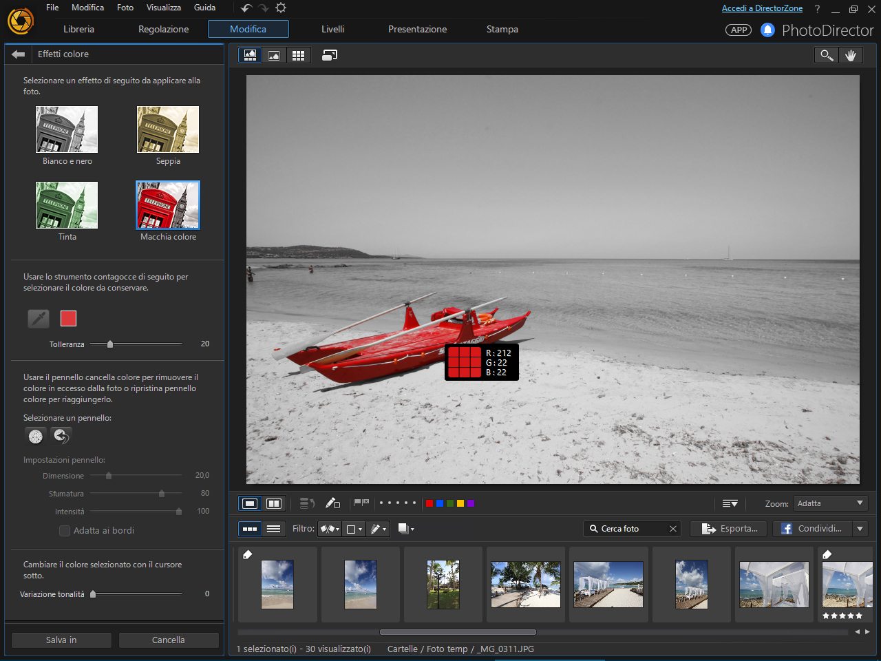 Il nuovo PhotoDirector offre il filtro Macchia colore, che elimina le informazioni cromatiche tranne che in una zona selezionata. Per rifinire la selezione si usa un pennello molto efficace.