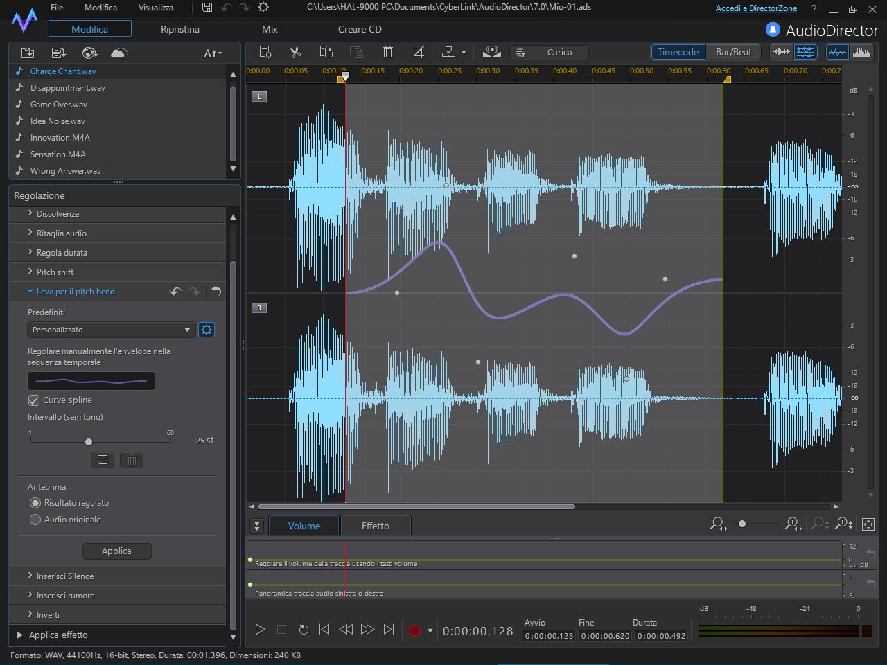 Il nuovo filtro Leva per il pitch bend di AudioDirector varia il tono musicale in funzione di una curva definita con nodi direttamente nella finestra della forma d’onda.