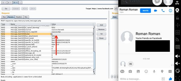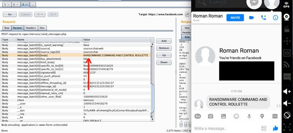 Ogni messaggio spedito con Facebook Messenger è identificato con un codice ID univoco. Proprio questa unicità  permetterebbe a chiunque in grado di avviare uno strumento di debug, di risalire ai codici ID dei messaggi e prendere di mira singole chat. Una volta trovato il codice identificativo del messaggio, spiegano gli esperti di Checkpoint nelle pagine del loro blog, si può alterarne il contenuto e immetterlo nuovamente nei server di Facebook senza che l’utente si renda conto di nulla. Un hacker potrebbe manipolare tutti i contenuti delle chat inserendo link che portano a codice malevolo e validarli aprendo le porte a ulteriori attacchi informatici. Per sostenere le loro tesi i tecnici di Checkpoint hanno realizzato e messo a disposizione anche un video che spiega nel dettaglio come potrebbe avvenire un attacco di questo tipo. Osservando le due schermate qui sotto si vede immediatamente come il contenuto del messaggio inviato (un semplice Hi) sia stato sostituito con il codice malevolo Ramsomware command and control roulette.