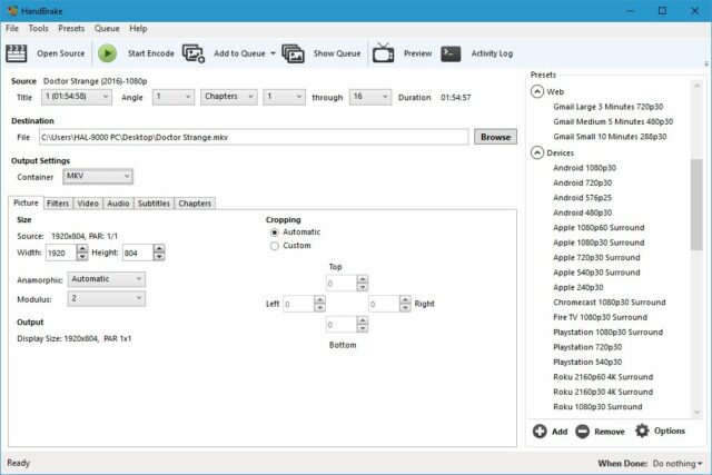 Capita spesso che i programmi gratuiti abbiano un’interfaccia astrusa e disordinata, con comandi disposti secondo una logica che solo l’autore del software comprende. Ma non è il caso di HandBrake, basato su un’area di lavoro organizzata in più pannelli, disposti con un ordine che segue il tipico flusso di lavoro per impostare i parametri di compressione. Nella parte alta sono allineati gli elementi per determinare l’input e l’output, a destra si trova il riquadro con i preset, mentre il resto dell’interfaccia è occupato da una sequenza di schede, accessibili con un clic sulla relativa linguetta. I preset sono veramente molti e sono pensati per chi non vuole perdere tempo con le regolazioni: se si conosce il dispositivo che sarà usato per la visione, basta caricare il preset relativo, impostare la destinazione dell’output e lanciare la compressione. L’elenco aggiornato ed esteso dei preset è una delle novità dell’edizione 1.0: vi si trovano impostazioni già pronte per i principali media player, le console, gli smartphone e i tablet.