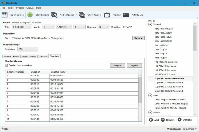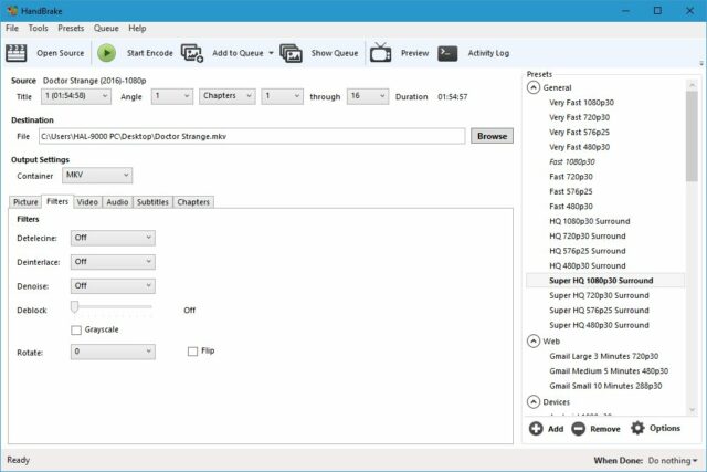 HandBrake effettua la compressione sfruttando l’accelerazione hardware con le Cpu Haswell e successive che implementano la tecnologia Intel QuickSync; inoltre, mentre lavora, permette di caricare un nuovo video e preparare un altro set di impostazioni, così l’utente può lanciare altre elaborazioni in modalità batch. L’elenco dei lavori in coda è visibile con un clic sul tasto Show Queue.