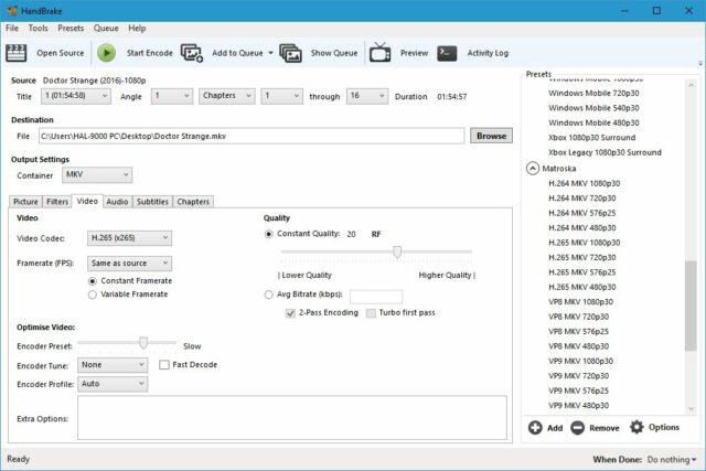 HandBrake è un software open-source dedicato alla compressione dei video non protetti, con interfaccia in inglese ma adatto sia ai principianti sia ai più esperti, poiché offre non solo numerosi preset pronti da usare ma anche un set completo di opzioni per regolare con precisione i parametri dei codec video. Il programma è ottimo per ricomprimere un filmato in modo che sia perfettamente compatibile con i dispositivi mobili, i media player o i computer poco potenti. HandBrake è disponibile per Windows, Mac OS e Linux, e accetta in input non solo i file nei formati video più diffusi ma anche le cartelle estratte dai Dvd Video e dai Blu-ray. I container per l’output sono esclusivamente Mp4 e Mkv.