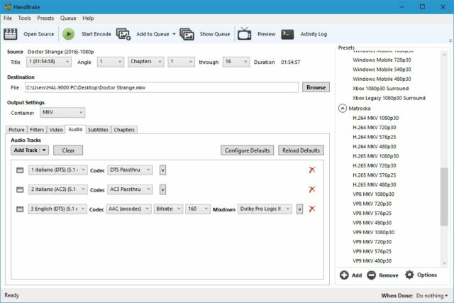 HandBrake gestisce più colonne sonore; per ciascuna permette di scegliere se lasciarle inalterate oppure se comprimerle con uno dei codec audio supportati.