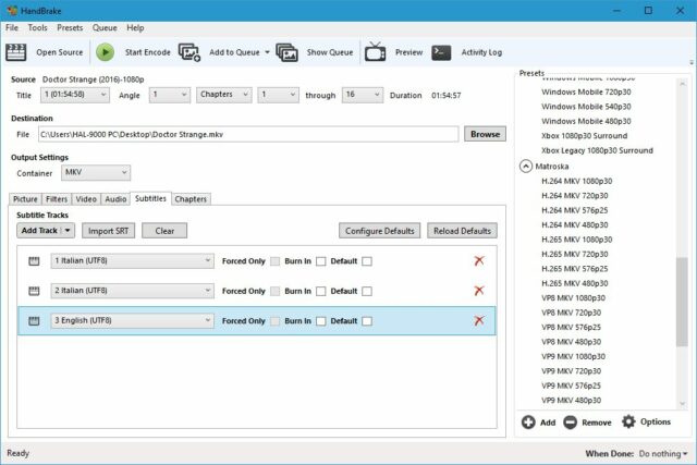 La scheda Audio permette di scegliere le colonne sonore tra quelle disponibili in input. Il programma può lasciarle inalterate (modalità Passthru) oppure ricomprimerle utilizzando uno dei codec audio supportati: Aac, Ac3, Vorbis, Opus, Mp3. In tutti i formati, con l’eccezione di Mp3, la codifica può essere anche a 5.1 canali. Il pannello successivo, Subtitles, è dedicato al caricamento dei sottotitoli, che possono anche essere stampati (Burn in) in maniera irreversibile nel video. Con l’opzione Forced Only il programma esegue una scansione dei sottotitoli che appaiono per meno del 10% del film, così da riconoscere le scritte visibili con dialoghi o testi inquadrati in una lingua straniera. Questa funzione è però attiva solo con i sottotitoli in formato bitmap dei Dvd.