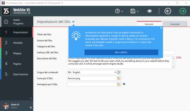 Al primo avvio, WebSite X5 accoglie l’utente con una serie di suggerimenti pop up che illustrano la sua struttura e spiegano come completare i primi passi.