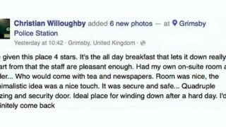 Christian Willoughby, arrestato a Grimsby (Gran Bretagna) ha passato una notte in cella di sicurezza e ha scattato delle foto per poi pubblicarle su Facebook a mo’ di recensione come avviene per alberghi e camere su servizi online come TripAdvisor o app come Foursquare.