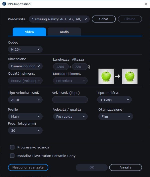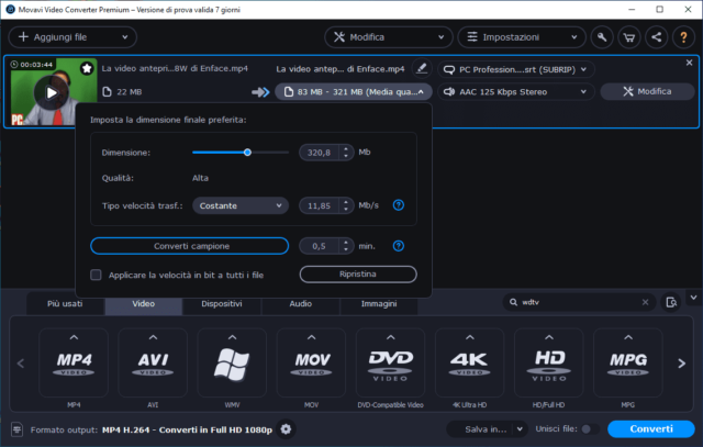 La finestra di impostazioni del formato consente di agire sui dettagli più evoluti, come la frequenza dei fotogrammi, il numero di passaggi di codifica e molto altro ancora. Movavi Video Converter permette anche di effettuare una conversione campione, di breve durata, per verificare il risultato prima di impegnare il sistema nel processo di transcodifica completo.