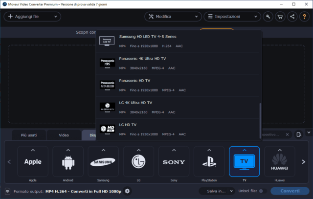 L’interfaccia del tool è piuttosto intuitiva: la parte centrale della finestra è occupata dall’elenco dei file da convertire, che possono essere aggiunti anche trascinandoli dal file manager, mentre lungo il margine inferiore si trovano i profili di output. Oltre a quelle generiche, Movavi Video Converter propone anche un lungo elenco di configurazioni ottimizzate per specifiche marche e modelli di dispositivo, dai set top box alle smart tv, dalle console ai dispositivi mobile, come smartphone e tablet.