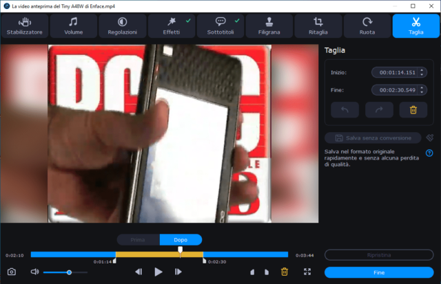 Come abbiamo già accennato, la versione Premium aggiunge alla dotazione una serie di strumenti dedicati alla modifica dei filmati, che possono essere tagliati per eliminare le parti meno interessanti, ritagliati per escludere dalla scena parti dell’inquadratura, ruotati oppure uniti. Inoltre, si possono applicare alcuni effetti interessanti, tra cui la stabilizzazione oppure il riempimento delle bande nere, che rende più gradevole la visione dei filmati verticali, come quelli catturati dagli smartphone, sui tradizionali schermi a prevalenza orizzontale.