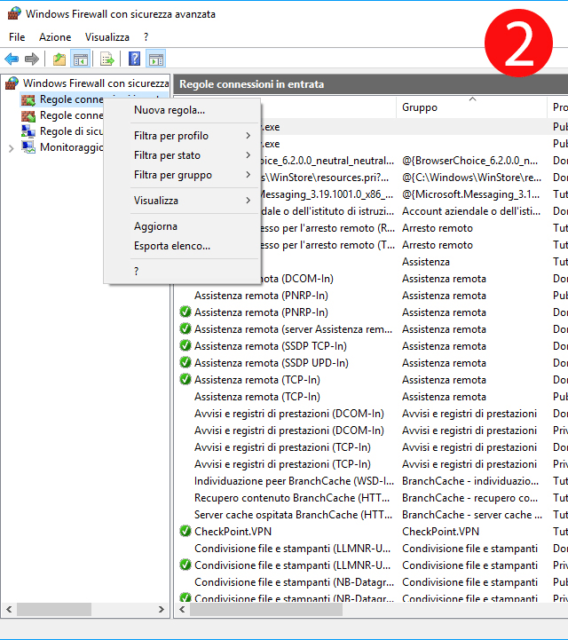 Raggiungete la casella di ricerca di Windows e digitate firewall (figura 1); selezionate la voce Windows Firewall con sicurezza avanzata nell’elenco dei risultati per aprire l’interfaccia di configurazione del firewall di sistema. Fate clic destro su Regole connessioni in entrata, nell’elenco di sinistra, e selezionate la voce Nuova regola nel menu contestuale (figura 2).