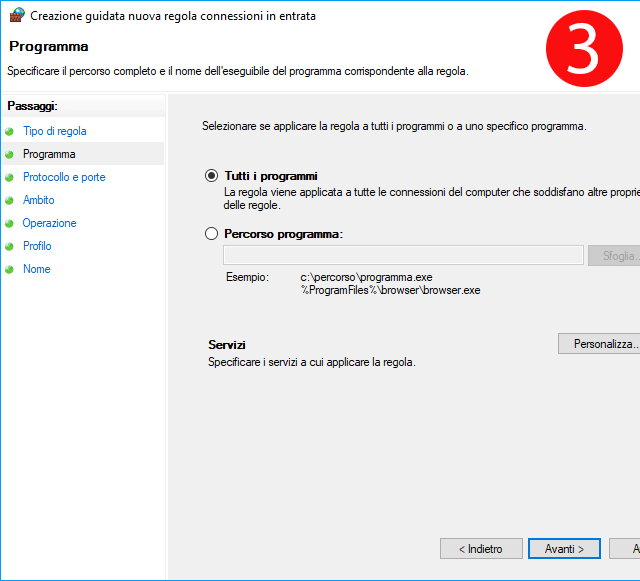 Nella procedura guidata che si apre selezionate Personalizzata, fate clic su Avanti e poi su Tutti i programmi per indicare a quali eseguibili si applica la regola (figura 3).