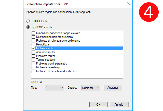 Raggiungete il passo successivo e selezionate ICMPv4 nella casella Tipo di protocollo; fate clic sul pulsante Personalizza, selezionate la voce Tipi ICMP specifici e spuntate l’opzione Richiesta Echo (figura 4). Ritornate alla procedura guidata e proseguite facendo clic su Avanti, fino a raggiungere la pagina Operazione: verificate che sia selezionata l’opzione Consenti la connessione e passate alla pagina Profilo. Qui potete decidere in quali ambiti deve essere valida la nuova regola: se la rete locale non ha implementato un dominio, i due valori significativi sono Privato (che identifica le macchine connesse alla rete locale) e Pubblico (in sostanza qualsiasi nodo Internet).