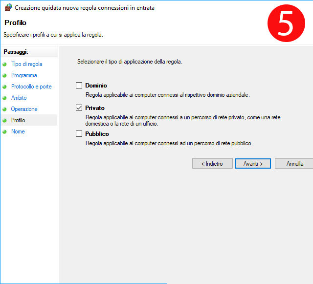 Per mantenere comunque un buon livello di sicurezza, è opportuno selezionare solo l’ambito Privato, salvo esigenze contrarie (figura 5). Nell’ultimo passaggio della procedura inserite un nome significativo per la nuova regola (per esempio Accetta Ping ICMPv4) e concludete la procedura con un clic su Fine. Per completare la configurazione create anche una seconda regola, relativa al protocollo ICMPv6, ripetendo la stessa procedura.