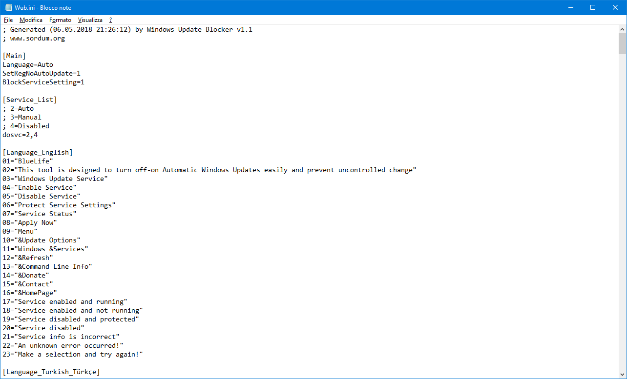 Modificando il file delle impostazioni di WUB, in pratica, possiamo disabilitare e bloccare i servizi nativi dell’OS Microsoft o anche quelli di terze parti installati da questo o quel software. Una volta scaricato l’archivio dell’ultima versione di WUB disponibile, apriamo il file Wub.ini contenente le impostazioni di configurazione del tool.