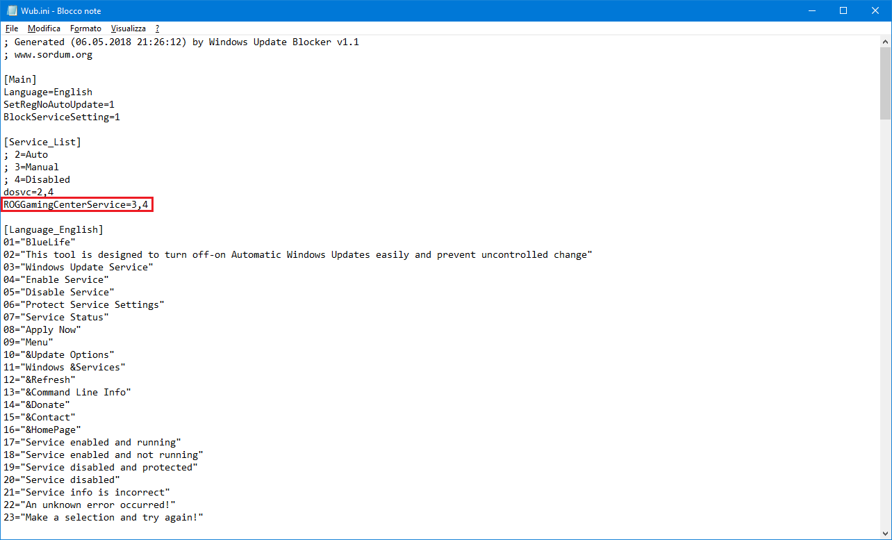 Solo a questo punto potremo cancellare la riga del servizio bloccato in Wub.ini (nel nostro caso ROGGamingCenterService=3,4) e salvare il file. Ora possiamo disabilitare ancora una volta di aggiornamenti di Windows Update con Wub.exe (Disable Service, Protect Service Settings, Apply Now), sicuri del fatto che il servizio bloccato in precedenza risulterà di nuovo accessibile e configurabile a nostro piacimento. Windows Update Blocker è disponibile in diverse lingue (italiano incluso) ed è compatibile con tutte le versioni di Windows da XP in poi, anche se da il meglio di se quando utilizzato su una qualsiasi release di Windows 10.